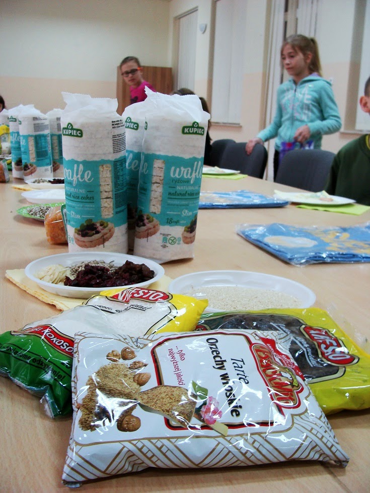 Następnie przystąpiliśmy do bardziej "brudzącego" zadania. Dlaczego brudzącego ? A no dlatego, że kolejnym zadaniem małych uczestników warsztatów, było przygotowanie mazurków wielkanocnych. Nie były to jednak klasyczne mazurki z ciasta kruchego. Nasze mazurki były wersją szybszą, prostszą i przede wszystkim zdrowszą. Powstały na bazie wafli ryżowych podarowanych przez jednego ze sponsorów warsztatów, a mianowicie przez markę KUPIEC. Wafle uprzednio zanurzone w płynnej czekoladzie, dekorowaliśmy przeróżnymi bakaliami. Szeroką gamę bakalii i nasion podarował nam nasz drugi sponsor, miarka KRESTO.